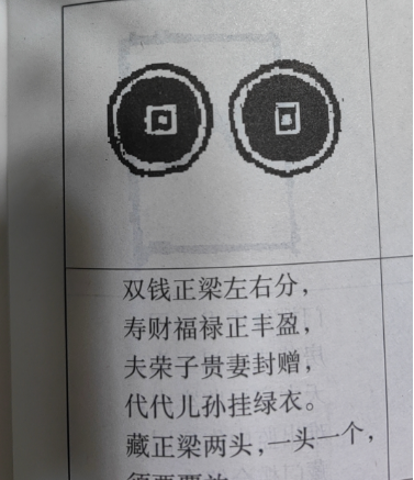 原文:金钱正梁左右分,寿财福禄正丰盈,夫荣子贵妻封赠。代代儿孙挂绿衣,藏正梁两头,一头一个,须要覆放。