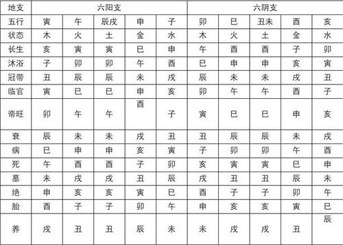 四局;水长生在申庚、临官帝旺在亥子壬癸,墓绝在辰巳丙戊。木长生在亥壬、临官帝旺在寅卯甲乙,墓绝在未申己庚。火长生在寅甲、临官帝旺在巳午丙丁,墓绝在戌亥辛壬。金长生在巳丙,临官帝旺在申酉庚辛,墓绝在丑寅丙癸。