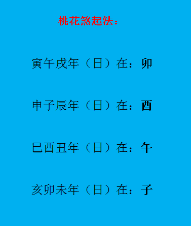 从以上桃花煞的起法中不难发现:简单的说,桃花煞就是从四个五行三合局中编排而定出的,也就是“寅午戌”三合火局中的第一个字“寅”字的前一个支辰“卯”字而定的;“申子辰”三合水局中第一个字“申”的前一个支辰“酉”字为桃花;“巳酉丑”三合金局第一个字“巳”的前一个支辰“午”字即桃花;“亥卯未”三合木局中第一个字“亥”的前一个支辰“子”即是桃花。鉴于桃花煞的起法其实是有着规律所循的,所以大多初学四柱八字的学者及至命师也就大多是循着这个从五行三合局中第一个字的前一个支辰起桃花的这套歌诀中死记硬背而起桃花煞,对于这套起桃花歌诀中的为什么这样排法的确切依据所在及意义,究竟有多少学者及命师能够正确的理解渗透就不得而知了。